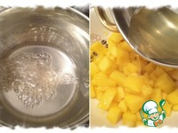 Выложить кубики манго на застывшее суфле и опять отправить торт в холодильник для застывания. |