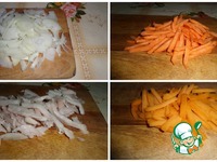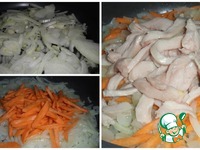 На сковороду наливаем растительное масло, выкладываем лук и морковь. Обжариваем до полуготовности. Добавляем куриное мясо. Обжариваем 10-12 минут. |
