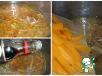Обжаренные овощи и куриное мясо выкладываем в кастрюлю. Добавляем 1 литр кипяченой воды. Доводим до кипения. Варим 10-15 минут. Добавляем соевый соус, затем тыкву. Варим минут 5. |