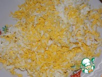 Яйца натереть на мелкой тёрке, добавить к сыру. |