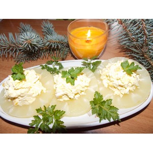 Выложить на ананас по 1ст. л. начинки. Вкусная закуска готова. Угощайтесь поварята!!! |