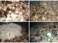 В сковороду наливаем растительное масло, выкладываем лук и грибы. Обжариваем 10 минут. Затем добавляем отваренную перловку, соль и сливки. Тушим 5-10 минут. Немного остужаем. |