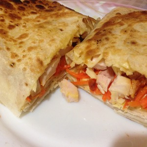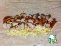 Для приготовления первой порции разворачиваем половинку лаваша, в центр укладываем слой натертого сыра и слой куриного мяса. |