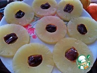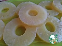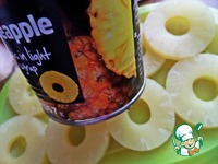 Свежий ананас чистим и делим на кольца. Консервированный просто вынимаем из банки и даём стечь. |