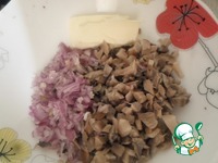 Лук и грибы мелко рубим, добавляем масло. Разминаем все вилкой. |