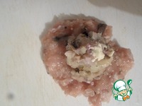 На лепешку из фарша и риса выкладываем начинку и формируем шарик. |
