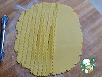 Оставшееся тесто также раскатать в пласт на рабочей поверхности и нарезать из него фигурным ножом полоски шириной около 1 см или чуть меньше. |