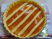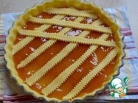 Выложить аккуратно полосочки теста поверх джема, наподобие плетёнки. Для этого сначала выложить слой полосок в одном направлении... |