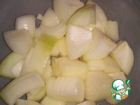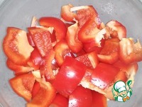 Обжариваем на раскаленной сковороде лук и перец с добавлением растительного масла, затем вливаем винный уксус, даем немного потушиться. |
