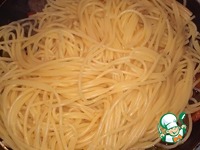Отвариваем спагетти в подсоленной воде до готовности, перекладываем их в сковороду и смешиваем с печёнкой. Выключаем плиту и даем немного постоять нашим макаронам под закрытой крышкой. |