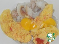 Филе очистить от мелких костей, добавить 2 желтка (белки убрать в холодильник) и кукурузную кашу с помидорами. |