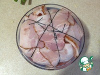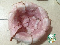 Бекон режем на тоненькие слайсы и выстилаем ним тарелочку что-бы края свисали. |