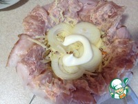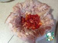 Мясо вместе с маринадом тоже выкладываем сверху на бекон. Режем перец на небольшие кусочки, слегка солим его и выкладываем в шар. |