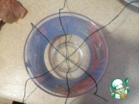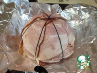 Накрываем мясом и беконом которые свисали с тарелочки формируя шар и завязываем ниточками. |