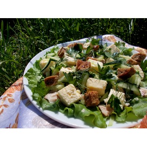 Описание: Очень простой и вкусный салатик. Сухарики готовим самы, делая салат еще и полезным, а сыр конечно можете добавить на ваше усмотрение, но у меня был козий, домашний.