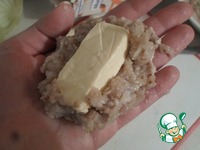 Берем не много фарша в него вкладываем брусочек сыра, формируем продолговатую котлету. |
