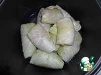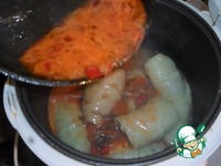 По истечении 20 минут с начала тушения, в чашу к голубцам вливаем соус и тушим до сигнала, под закрытой крышкой. |