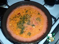 Воду, сметану и томатную пасту, перемешиваем до однородности, вливаем к пассированным овощам. Добавляем зелень. |