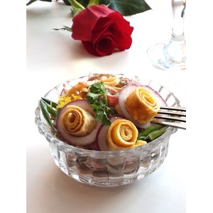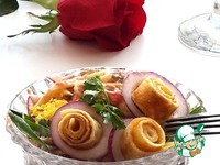 Несколько ленточек яичного блина сверните рулетиком и поместите их в кольца лука, украсьте салат. |