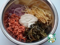 Нарежьте остывший яичный блинчик соломкой, полукольцами нарежьте красный салатный лук, отварной лосось разомните вилкой, добавьте к этим ингредиентам морскую капусту и заправьте соусом. |