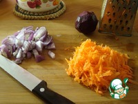 Свёклу тоже трём на тёрке, болгарский перец режем кубиком. |