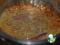 9. Затем влить молоко, смесь будет бурлить и карамель частично застынет. Довести смесь до кипения, чтоб карамель растаяла. Корицу вынуть. |