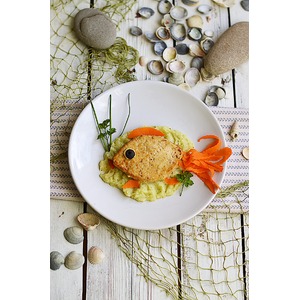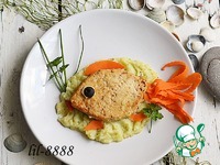 На тарелку выложить пюре, сверху котлету. Из моркови сделать хвост и плавники. Из кусочка сыра и маслины сделать глаз. Украсить по желанию. Приятного аппетита! |