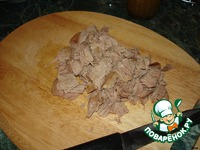 Мясо порезать мелкими кусочками или разделать по волокнам. |