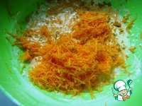 Добавить натертую на мелкой терке морковь (очищенную морковь я взвесила - её вес 200 грамм) и цедру апельсина. Перемешать. |