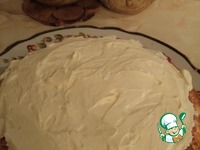 Собираем торт, нижний корж у меня тот, который был верхом при запекании, на него выкладываю равномерно крем и накрываю второй частью. |
