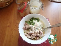 Куриное отварное мясо порезала небольшими кусочками. Петрушку порубила мелко. Выложила в салат майонез. |