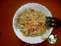 Морковь трем на крупной терке, лук, перец и помидор режем мелкими кубиками. На растительном масле обжариваем овощи добавляя последовательно: лук, морковь, перец, помидор, подсаливаем. |