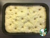 Продавите пальцем небольшие дырочки в тесте (как на фото). Как и при работе с тестом, чтобы тесто не прилипало обмаките пальцы в оливковое масло, либо в муку. |