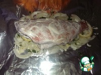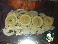 Укладываем рыбу. Сверху в обратном порядке: 2 полукружка лимона, чеснок, зелень, лук, соль, перец. |
