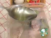 Наливаем в стакан теплой воды (не горячей, а то рыба сварится!) и кладем в него столовую ложку соли, перемешиваем. Для второй рыбы рассол идентичный)) |