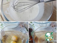 Соеденить обе смеси и тщательно перемешать. Далее вмешиваем муку, добавляя постепенно, по паре столовых ложек. Вымешиваем сначала венчиком, потом деревяной лопаткой |