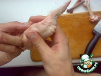Вынимаем из крыла два сустава, не повредив кожи, срезая жилы от костей. Последний сустав не трогаем. |
