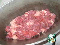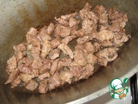Говядину нарезать кусочками против волокон. На масле, на среднем огне потушить мясо под крышкой. |