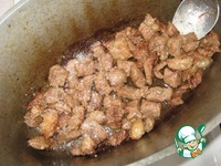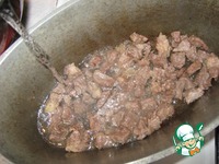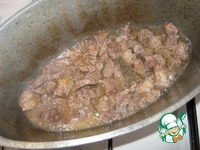 Таким же образом и в третий раз вливаем воду, тушим и обжариваем. За счет этого за 45 минут мясо становится очень нежным и тающим во рту. |