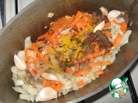 Добавить все специи, чеснок, лук, морковь. Обжарить. Чеснок не очищать! В готовом плове будут встречаться пропаренные зубчики - это очень вкусно!!! |