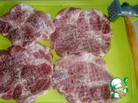 Первым делом надо замариновать мясо, часа за 2 минимум - это в идеале. Мясо отбить, добавить соль и перец, уложить в посуду и залить вином - немного помять, оставить мариноваться. |