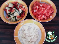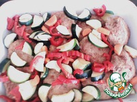 Тонко нарезанный кабачок, морковь, нарезанный соломкой болгарский перец уложить на тефтели. |