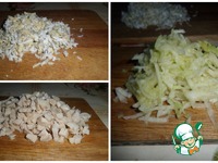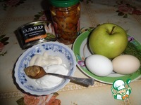 Кальмара нарезаем мелким кубиком, отварные яйца трем на терке, яблоко также трем на терке. Грибы откидываем на дуршлаг. |