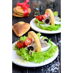 Описание: Предлагаю вам вариант закуски из сельди с овощами под хрустящей хлебной полусферой с ароматом чеснока и добавлением кукурузной муки и аналогичными хлебцами в форме сердечек на праздничный стол для двоих! Порадуйте свою половинку такой закуской, уверена её обязательно оценят!