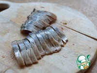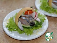 На салат - кругляши огурца, на него - кусочки сельди, пристроить рядом помидорку; |