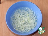 1. Приготовим салат. Лук нарезать полукольцами, залить кипятком, добавить уксус и сахар по вкусу, оставить на 10 минут. Затем воду слить и лук охладить. |