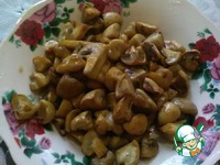 Моем шампиньоны и режем их произвольно, но не очень мелко. Заливаем масло в сковороду и обжариваем грибы на сильном огне до золотистого цвета. |