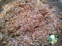 Добавляем к луку и моркови перловую крупу, грибы, соль, черный перец, чеснок (сухой) и, помешивая, обжариваем все ингредиенты еще 5 минут. |