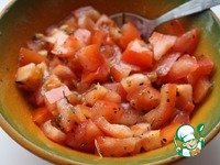 Помидоры нарезать небольшими кубиками, приправить солью, перцем, сушеной мятой и растительным маслом (1 ст. л.), перемешать. |