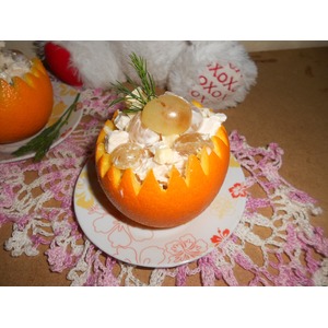 Смешать в чашке нарезанную грудку, сыр, виноград. Поперчить и заправить майонезом. Выложить салат в апельсиновые корзиночки. |